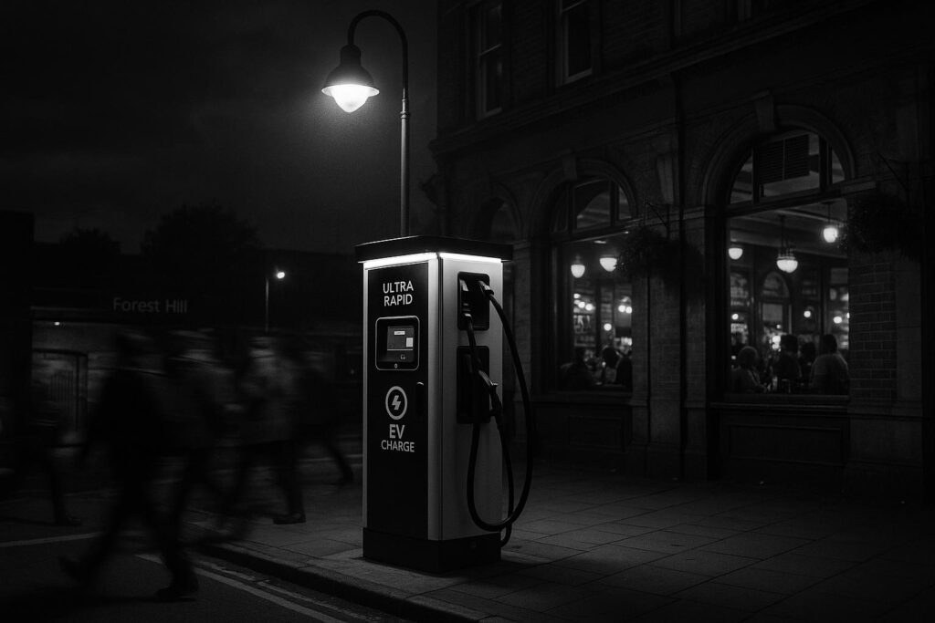 The Forest Hill installation is fitted with six ultra-rapid charge units—three rated at 150 kW and three at 300 kW—arranged to serve twelve vehicles simultaneously, including a designated priority bay, according to RAW’s announcement. The hub is integrated with the Dartmouth Arms, the MEATliquor-operated pub at 7 Dartmouth Road, and RAW has said the first 25 drivers each day during the opening promotion will receive MEATliquor vouchers. The site sits roughly 200 metres from Forest Hill station, positioning it on a busy south-east London commuter corridor and aiming to capture both local and passing demand.